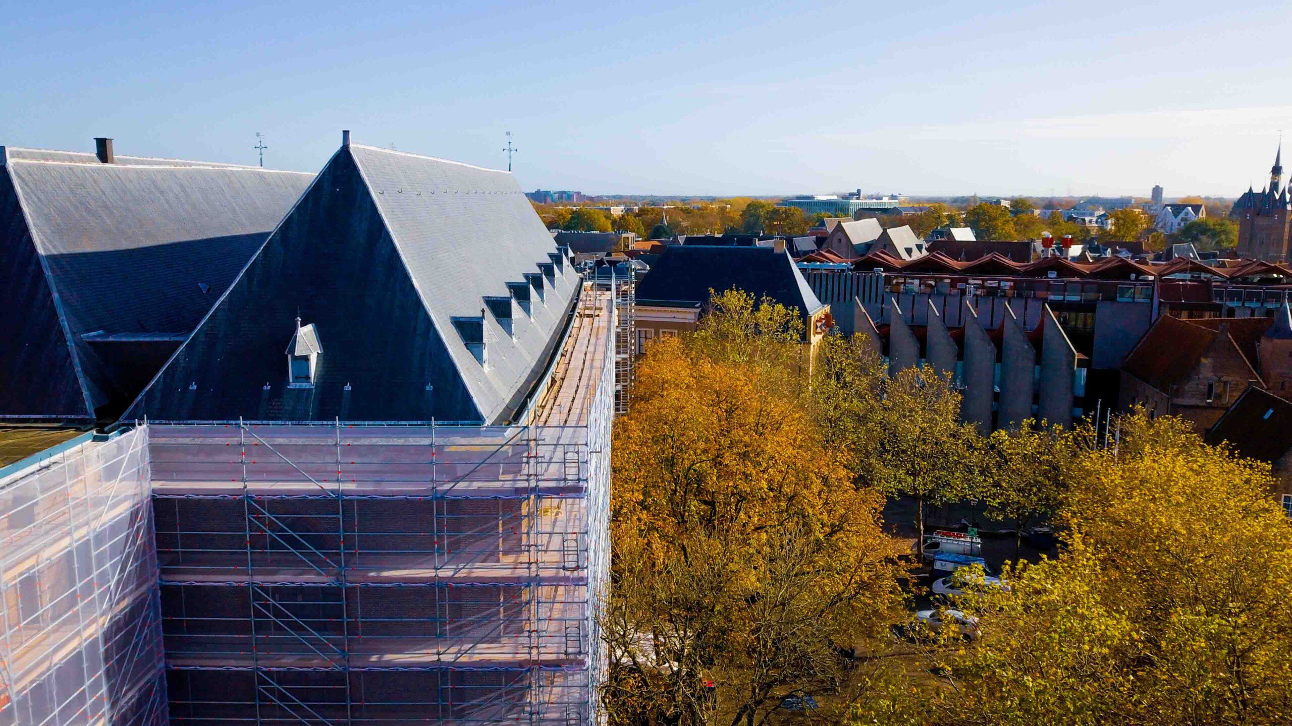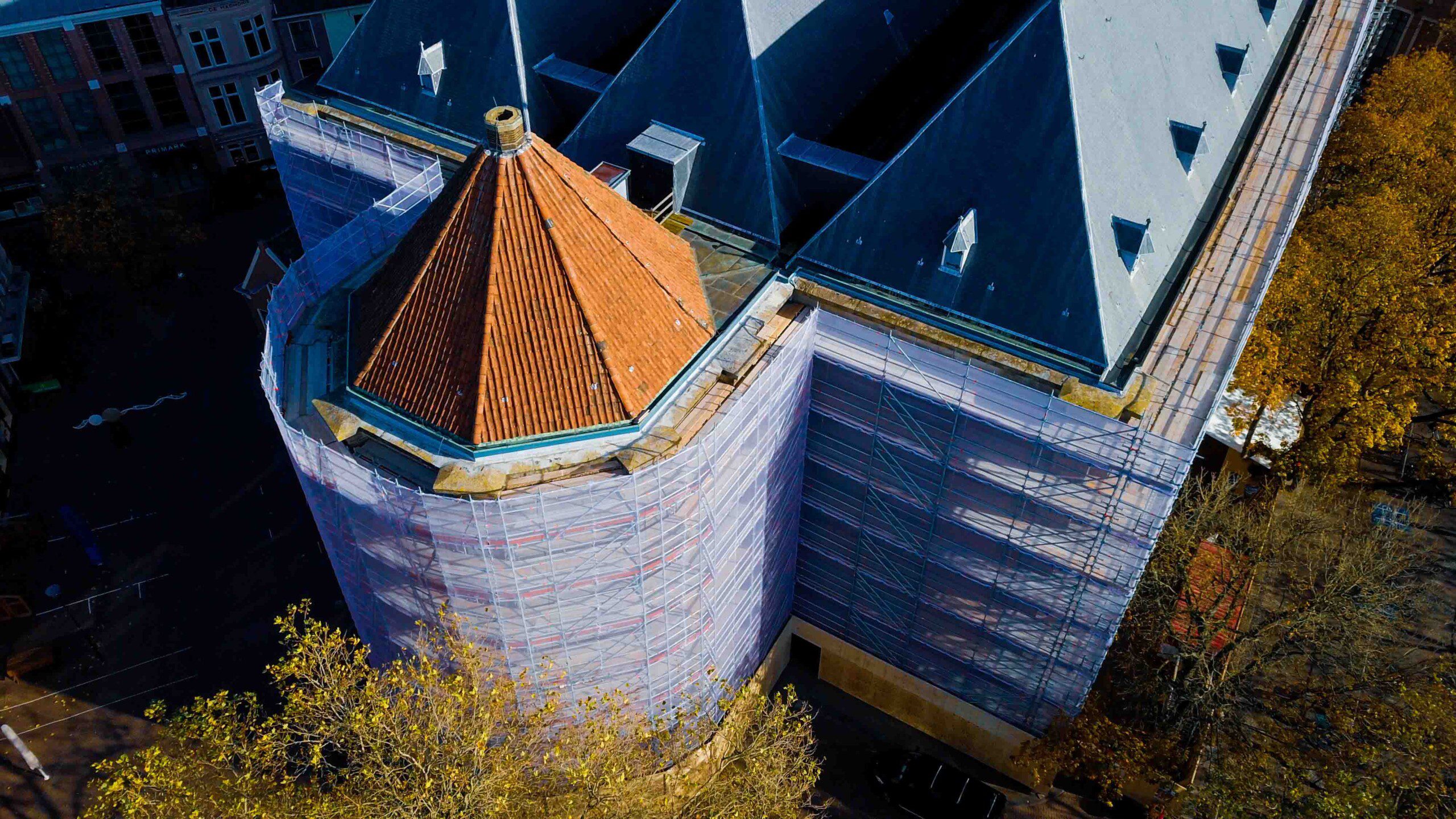 Aan de buitenzijde werd het voegwerk, de dakgoten en de dak structuur nagekeken en vervangen. Daarnaast werden de in de loop van de tijd los gekomen stenen en een deel van de leien op het dak vernieuwd. Hiervoor werd een 1,40 m breed Layher All-round gevelsteiger gebruikt van in totaal 4800m² steiger.